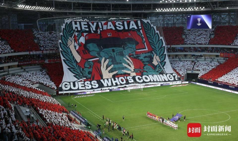 此外,TIFO还融入三星堆青铜纵目面具,既增强视觉震撼力,又隐喻成都球迷是一股神秘而强大的力量。徐阳说,“HEY! ASIA!(你好!亚洲!)”表达作为亚冠赛场初来乍到者对亚洲球队的尊敬,“GUESS WHO'S COMING?(猜猜谁来了?)”兼具含蓄与霸气,既体现中国人的谦逊,又针对亚冠精英赛(本场为附加赛)潜在对手传递信号 —— 提醒他们可能将面对成都这样神秘且强大的对手。